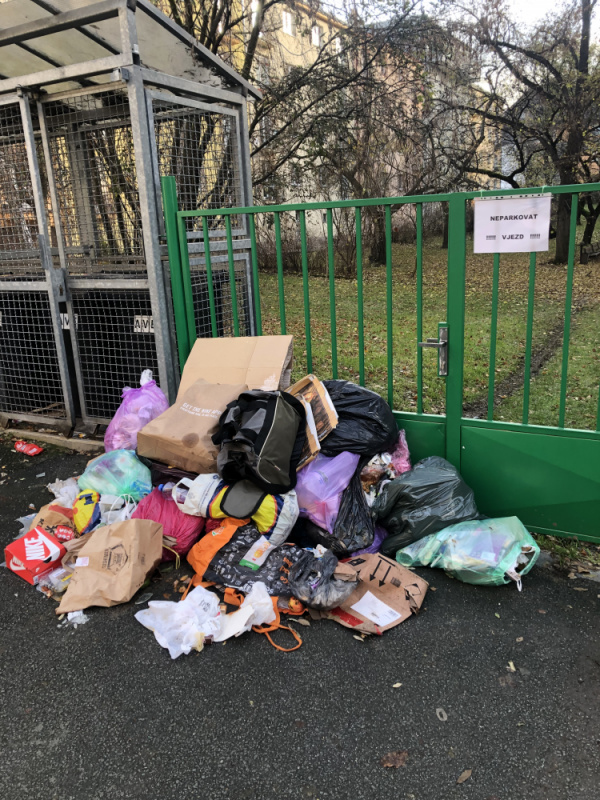 Vyhazeny odpad pred u kleci s popelnicemi. Mnozstvi odpadu, ktere blokuje vjezd do dvora, ktery je je vyuzivan denne rodici s kocarky a pripadne pro vjezd aut udrzby zelene ve vnitrobloku apod.