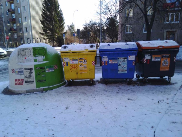 Velký nepořádek kolem nádob na tříděný odpad. Nádoba na plasty přeplněná.