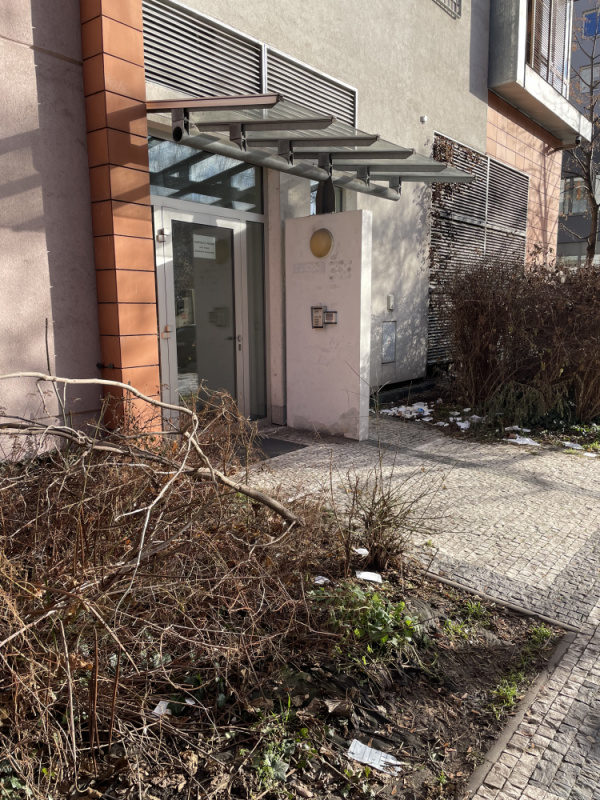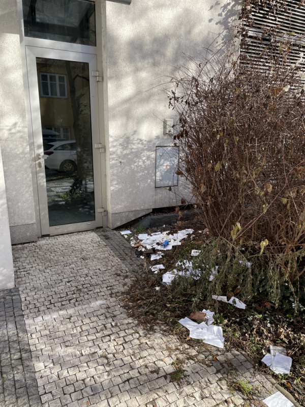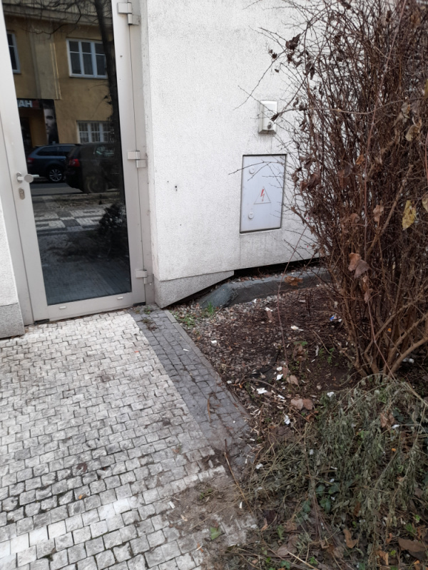 Rozhazene odpadky v ulici Lukasova 2. Na jedne strane u vchodu je odlomena vetev, na druhe strane odpadky. Viz foto.