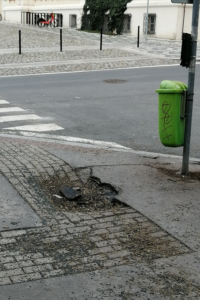 Sabinova ulice - dlouhodobý propad chodníku, který se časem zvětšuje/prohlubuje.