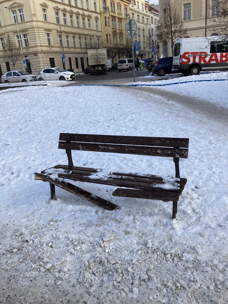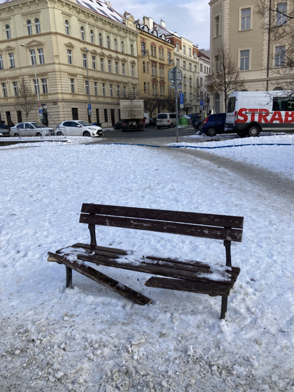 Rozbitá lavička na nám. Jiřího z Poděbrad naproti poště.