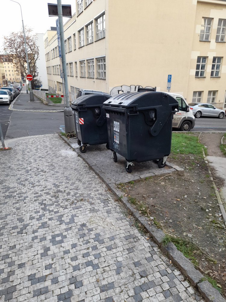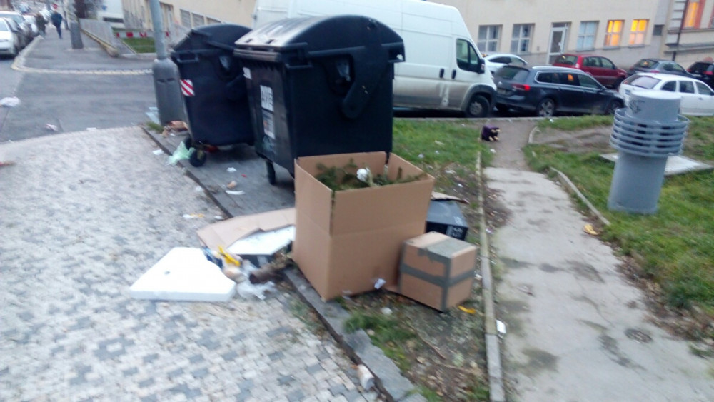 Nepořádek u kontejnerů na rohu Jeseniovy a Blahoslavovi.