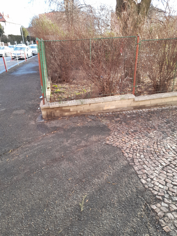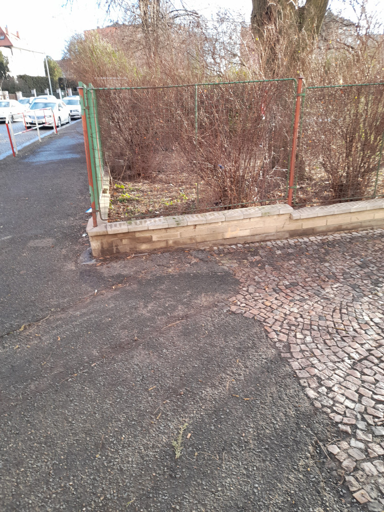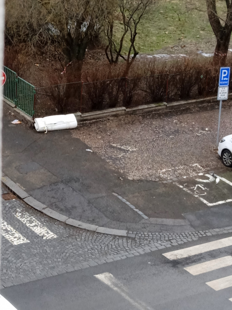 Stočená matrace a kovová část štendru na rohu ulic Ambrožova a Jeseniova u plotu bývalé mateřské školy