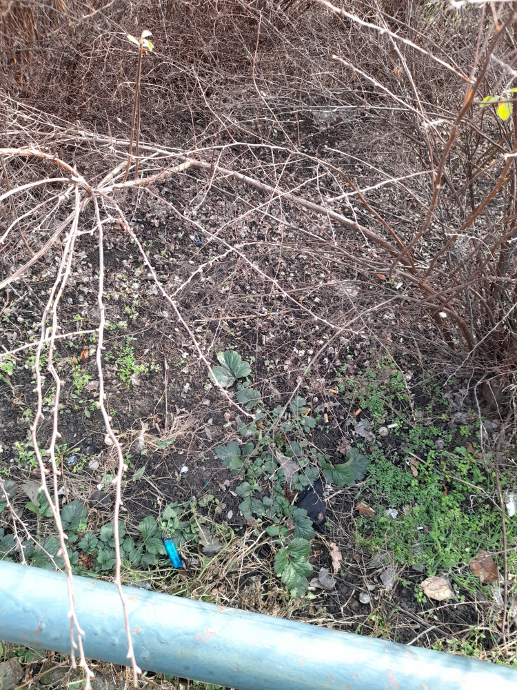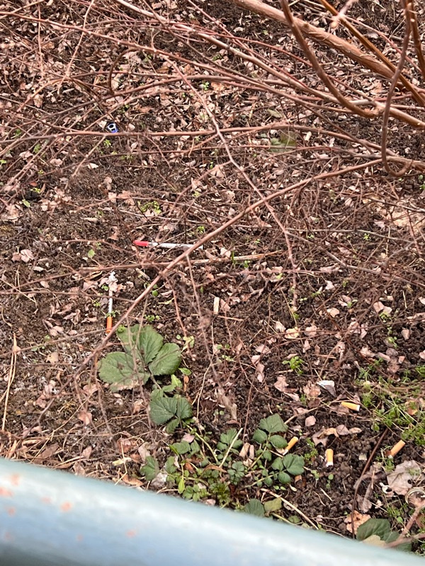 Injekční stříkačky v křoví před Albertem