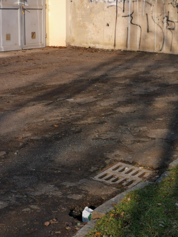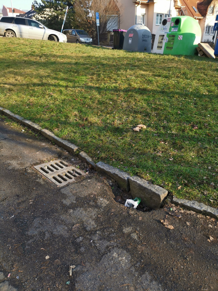 Hluboká kaverna/propadající se vozovka, obrubník u kanálové vpusti na pozemku před garážemi sousedící s křižovatkou Pod Lipami / Plavínová. Pozemek 3606/61 je ve správě MČ Praha 3. Hrozí úraz nebo propadnutí vozovky pod vozidly.