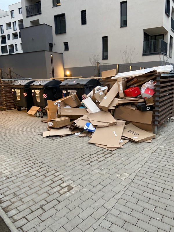 Dobrý den, za pořádek a úklid okolo nádob na komunální odpad je dle zákona odpovědný vlastník či SVJ domu. Ti také musí zajistit, aby nedocházelo k znečišťování okolního veřejného prostoru. Neoprávněné umístění odpadové nádoby jste měli neprodleně řešit se svozovou společností, případně s Policií ČR... Pokud k znečišťování bude docházet opakovaně, budete pokutováni až do výše 100 tis. Kč. S pozdravem MČ-P3
