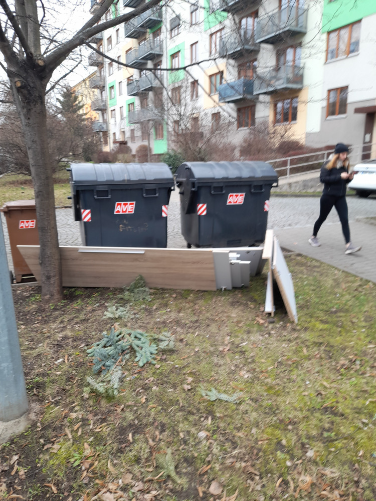 U kontejnerů na směsný odpad se objevila celá rozebraná šatní skřín. U popelnic na bioodpad je zároveň nepořádek. Obojína stejném místě Pod Lipami 33.