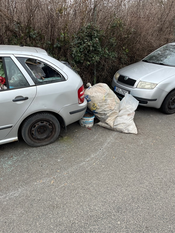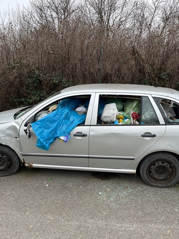 Vrak automobilu zcela naplněný odpadem. Vozidlo tu v tomto stavu stojí již několik měsíců.
