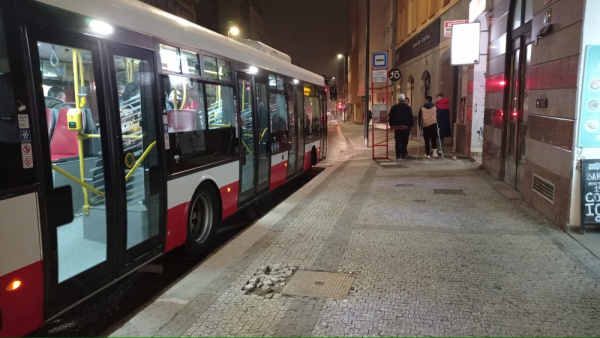 Na autobusové zastávce Tachovské náměstí směr Florenc se nachází díra v dlažbě chodníku.