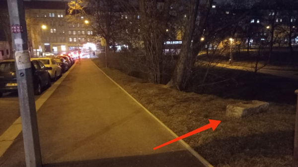 V ulici Siwiecova se u lampy 300 664 nachází již několik měsíců odložený kus žulového obrubníku.