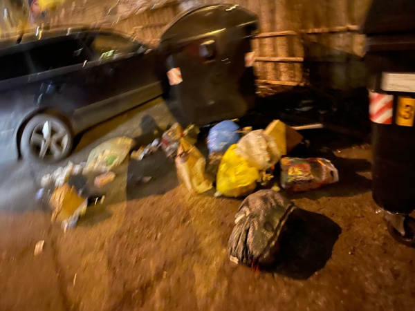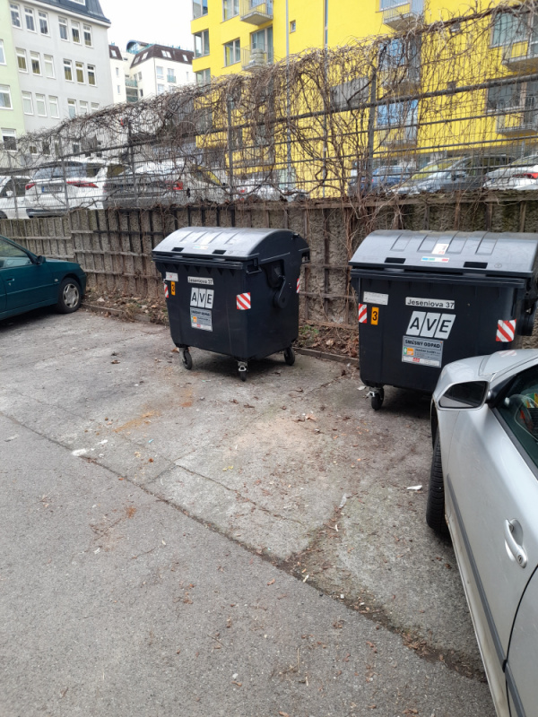 Neporadek kolem kontajneru, dlouhodobe odlozene dopravni znacky.