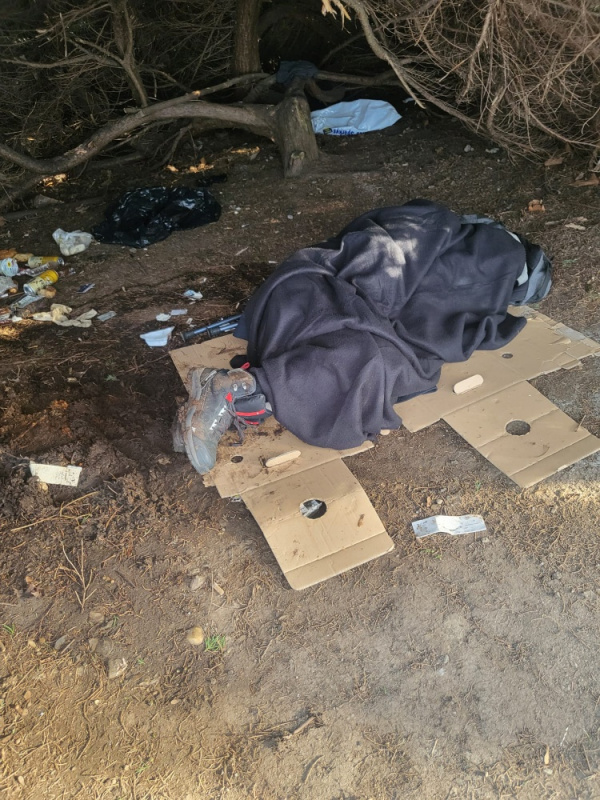 nepořádek i s bezdomovcem pod keři u zastávky tramvaji v parku Prazacka