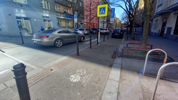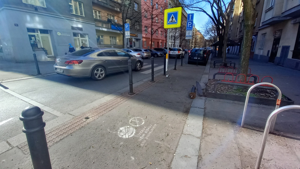 Vyvrácený sloupek na chodníku Biskupcova před kinem Aero.