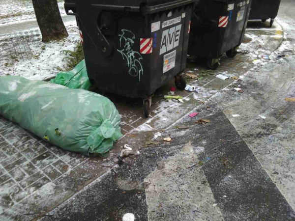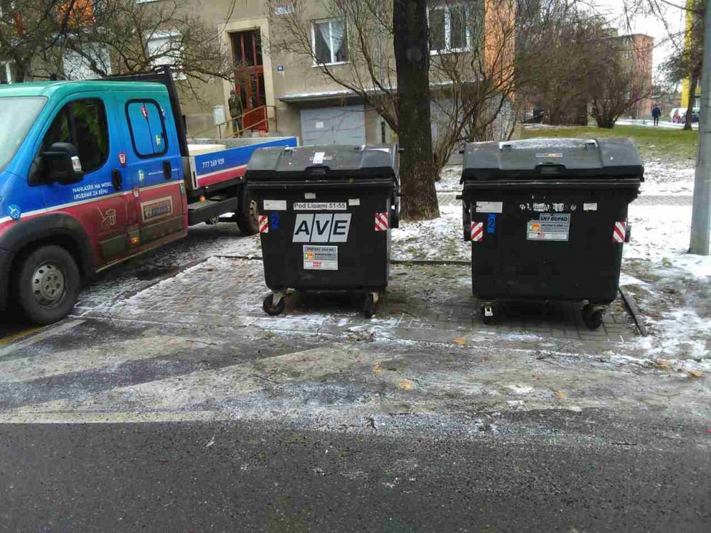 Jako každé pondělí, tak i dnes nechali popeláři u kontejnerů spoustu nepořádku. Jsou tu velké pytle s čímsi i drobný nepořádek z domovního odpadu.