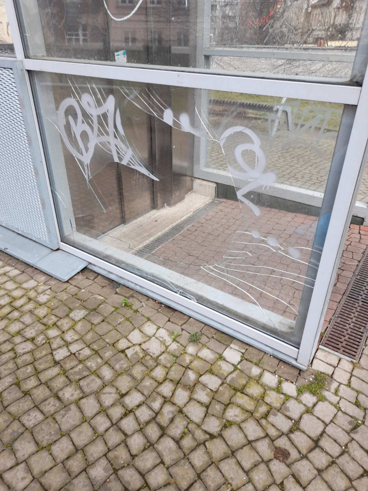 Rozbite sklo na vytahu v Parku za Lupcovou 20