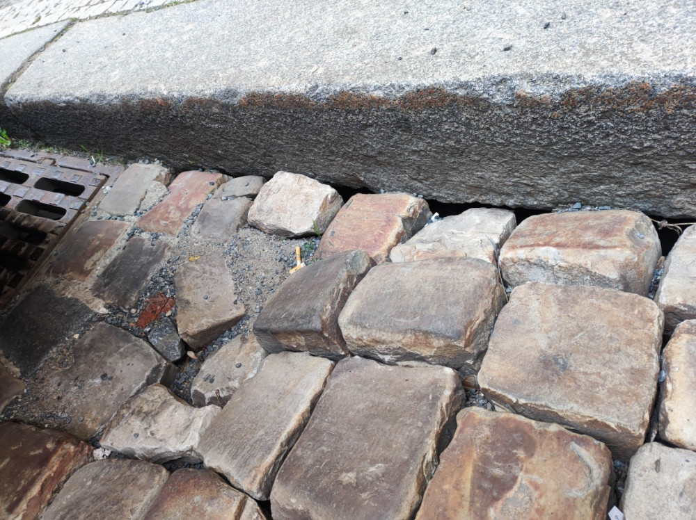 Propadající se vozovka okolo kanalizační vpusti, podemletý obrubník. Na pomezí domů Krásova 18 a 20.