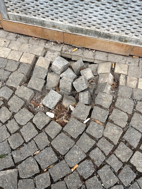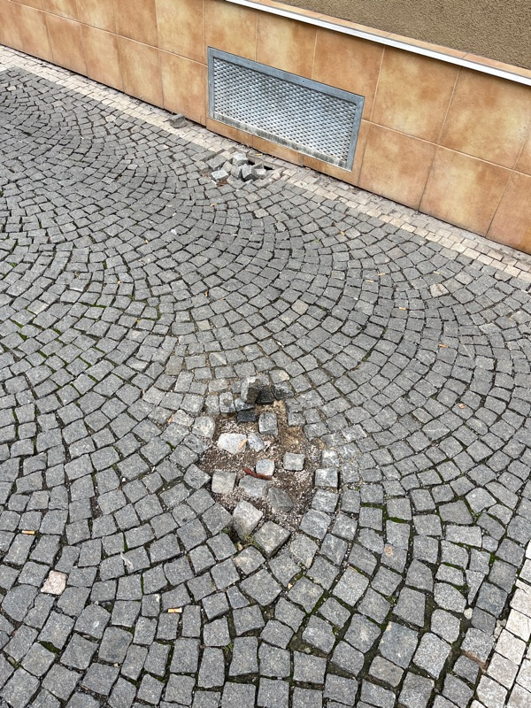 Rozbitý a propadající se chodník, velmi nebezpečné.