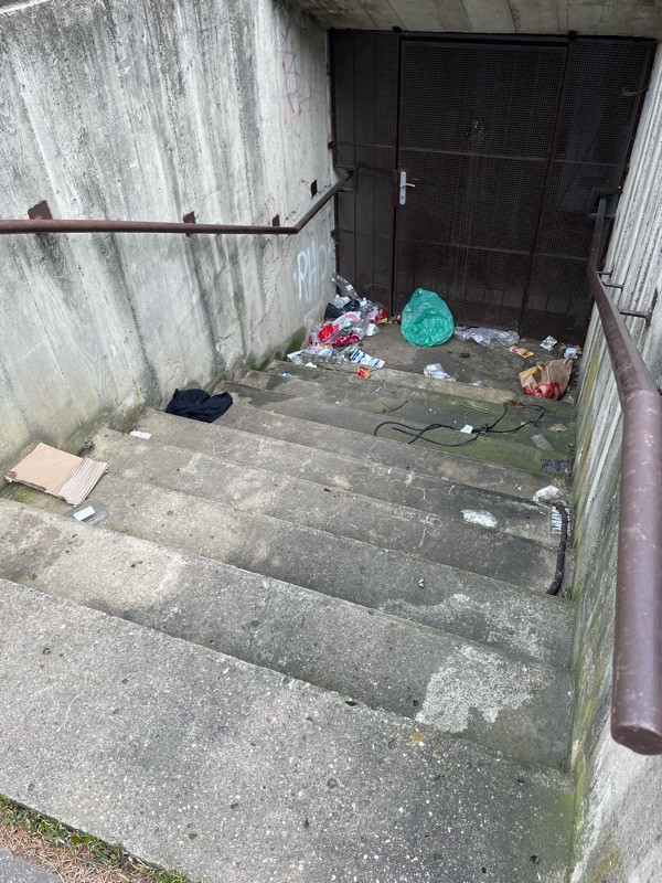 Dobrý den, kolem kontejnerů na tříděný odpad je nepořádek. Odpad se dostává do oblasti schodů za kontejnery.