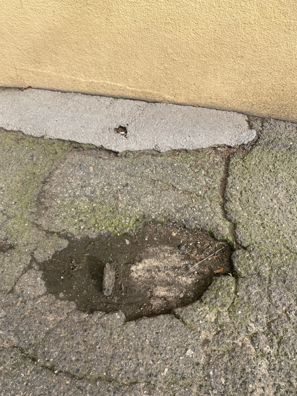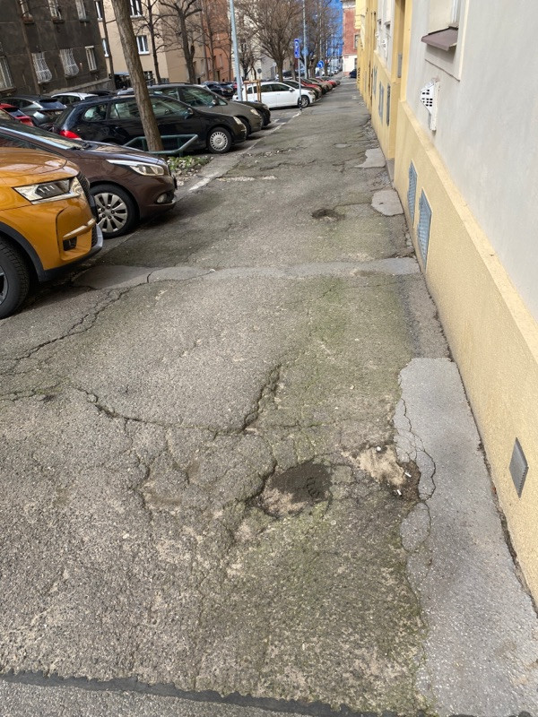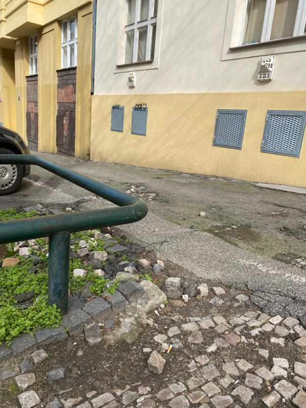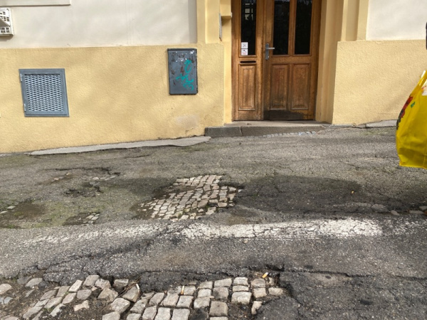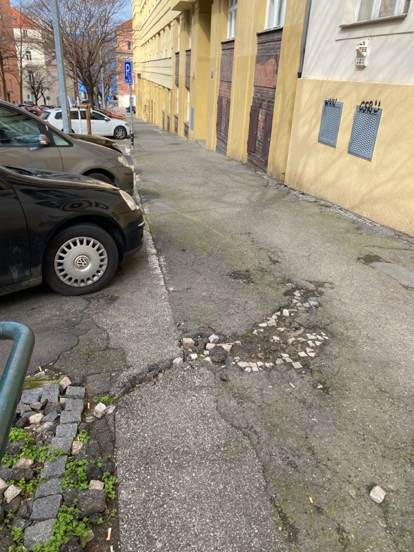 Chodník před domem Baranova 20 je zničený, plný děr a drolícího se asfaltu, po zimě se navíc kusy asfaltu odlupují v kusech