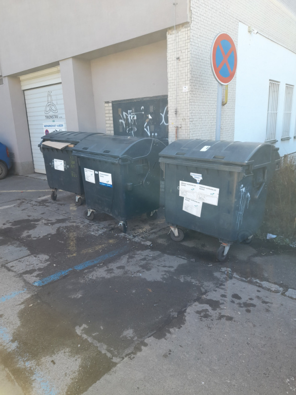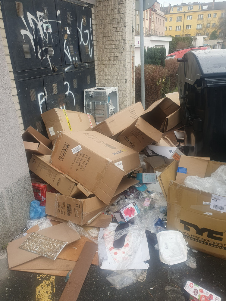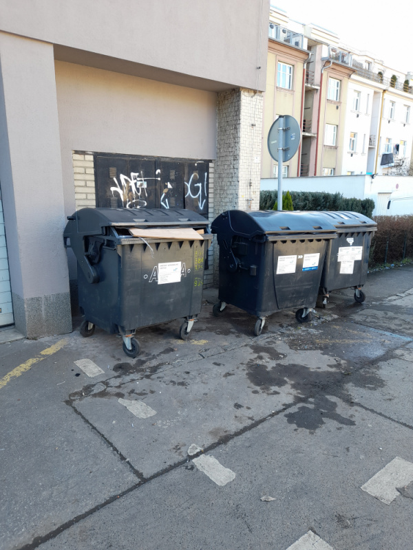 dlouhodobý nepořádek kolem popelnic naproti vchodu do kempu Pražačka, ulice Nad Ohradou.