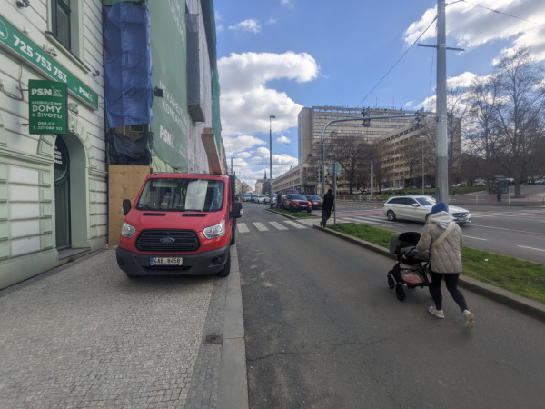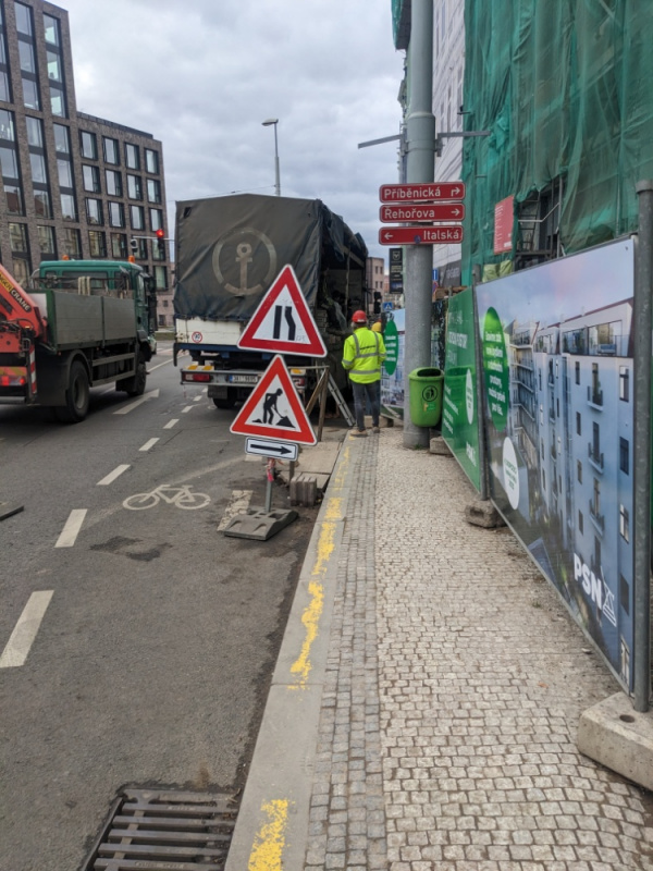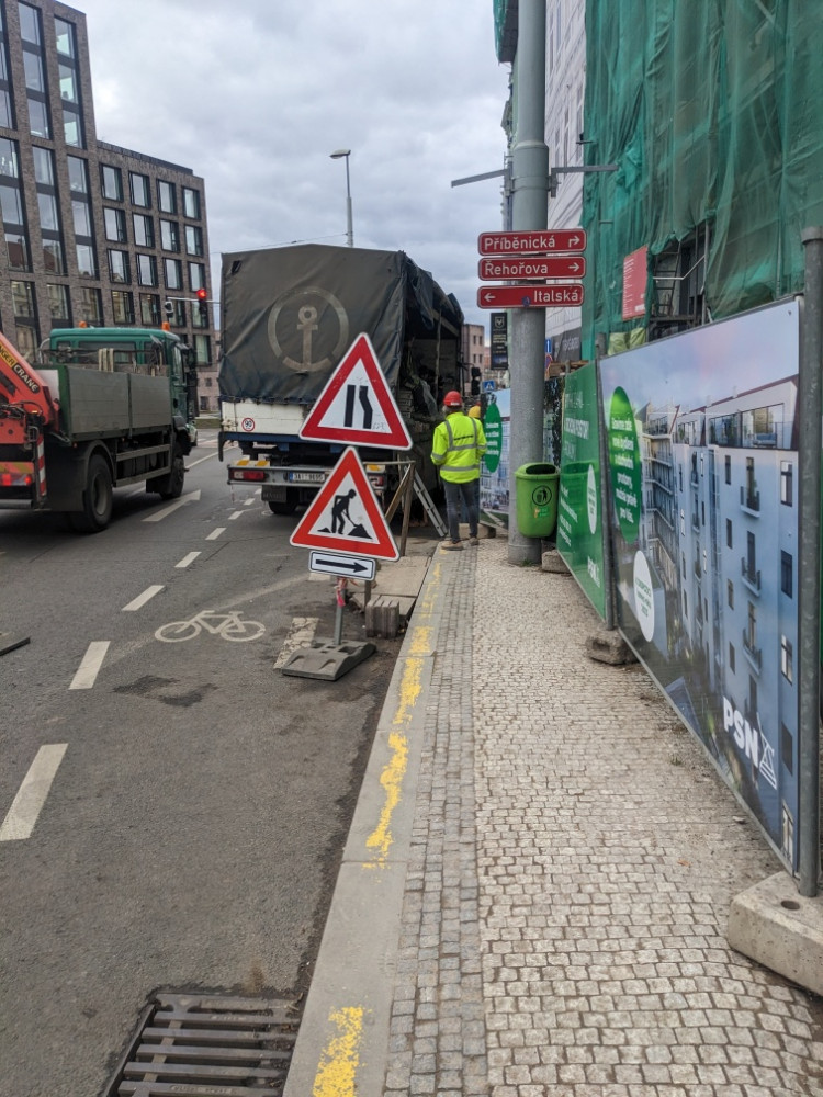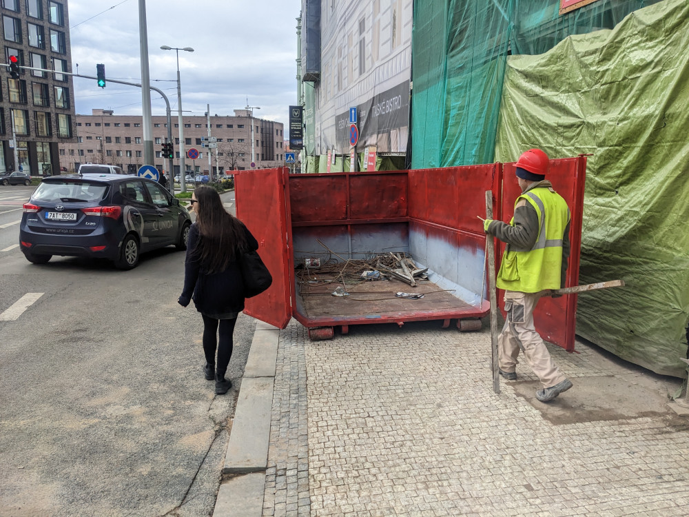 Denní chleba chodců u stavby na Seifertově ulici (naproti VŠE). Auto, bagr, kamion, kontejner.... zastaví na vyznačené žluté zóně, zablokuje i tu malou část chodníku, která zbývá. Na dotaz "kudy projít?" odpoví zamestnanec Metrostavu, že silnicí z levé strany náklaďáku. Žádný vyznačený zábor, žádná snaha se o průchodnost komunikace postarat. Přitom jít po rušné silnici není komfortní pro běžného chodce, natož pro lidi s kočárkem či o berlích (o těch na vozíku nemluvě).