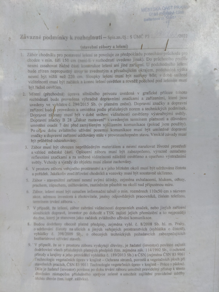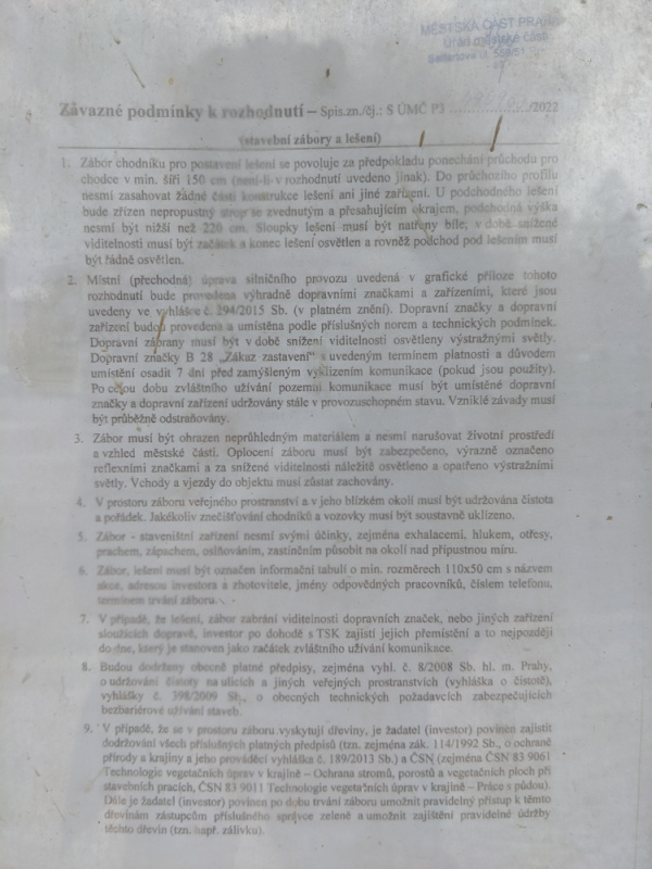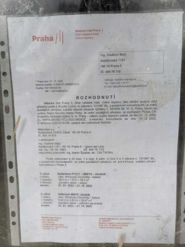 rád bych se ještě zeptal, když (jak píšete) nemá MČ Praha 3 ohledně dotčeného chodníku žádné pravomoci, jak je možné, že na stavbě visí (minulý týden bylo ještě zakryto, a tak jsem jej neviděl) přiložené rozhodnutí vydané 27.12.2022 pod spisovou značkou S ÚMČ P3 490900/2022 právě vaší městskou částí?