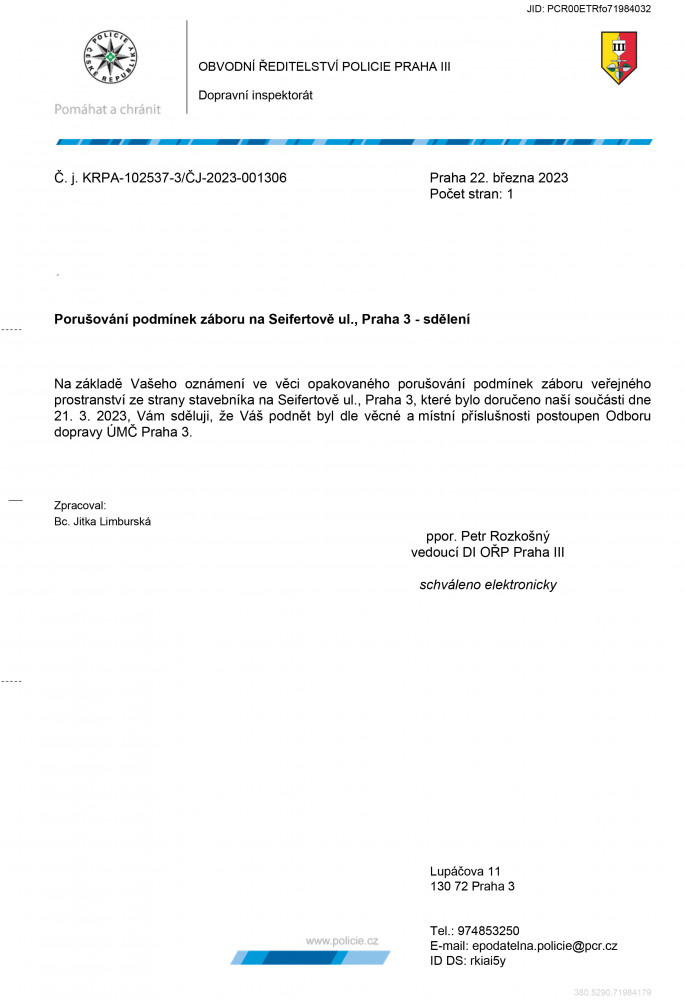 Pro dovršení absurdity vašeho výše položeného doporučení, abych se obrátil na Policii ČR, neb MČ P3 nemá ve věci žádné pravomoci, přikládám vyjádření PČR, která celou věc postoupila k řešení Odboru dopravy ÚMČ Praha 3.