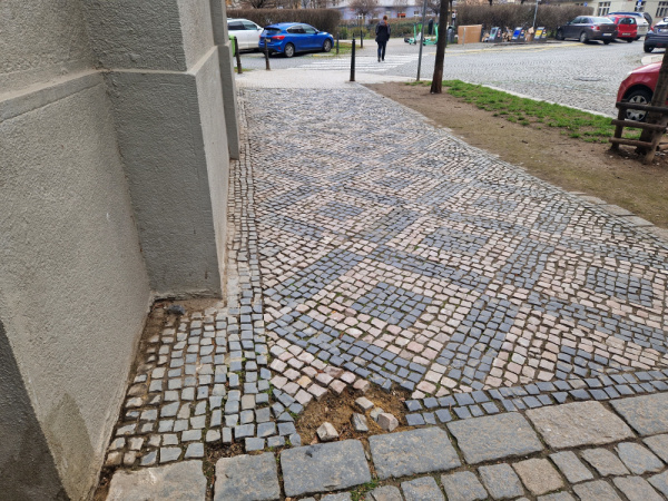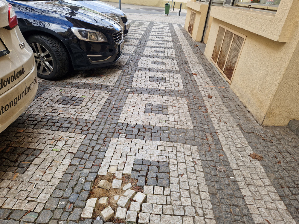Rozbita dlazba chodniku ulice Krizkovskeho kolem cp.4 a 16