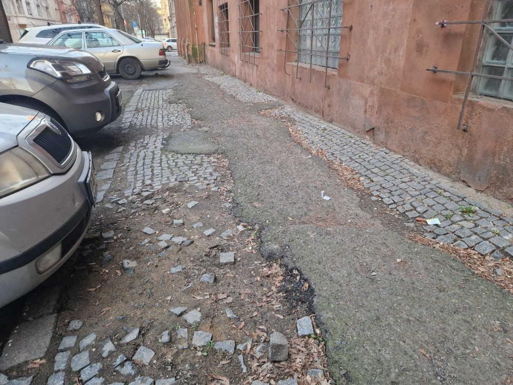 Rozbita dlazba chodniku ulice Sevcikova kolem cp.2