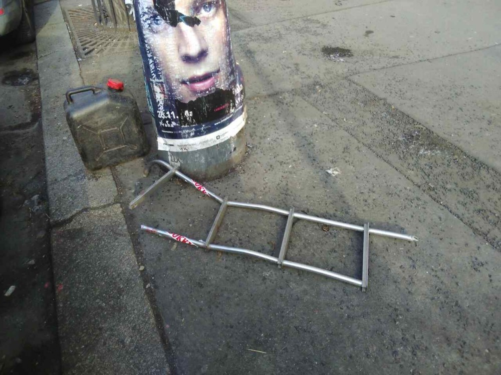 Odpadky zbylé po odtažení dodávky: žebřík, kanystry ..