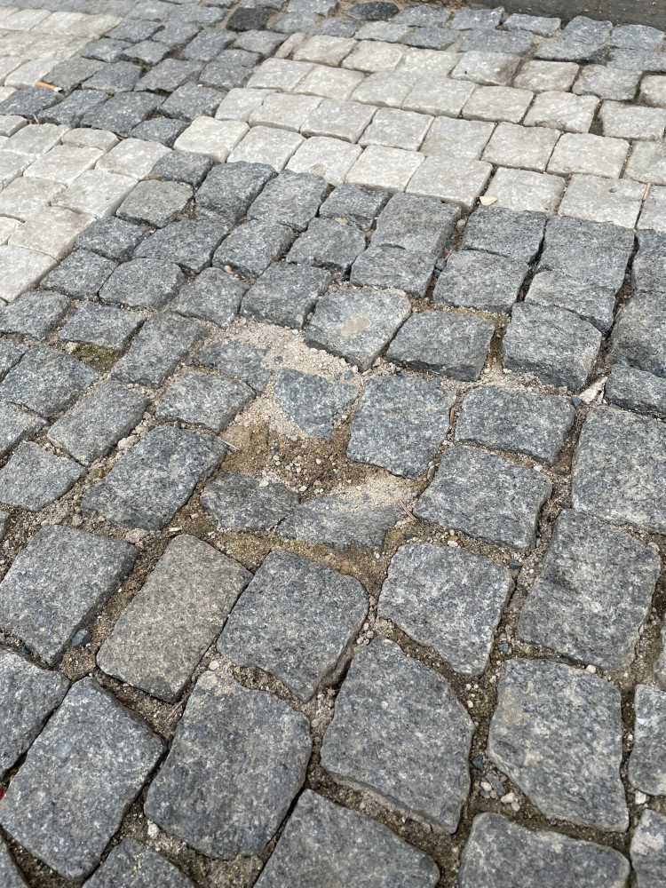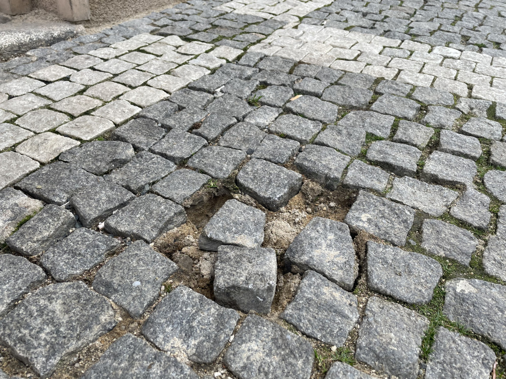 Vypadané kostky v chodníku přímo před vchodem do domu v ulici Sudoměřská 1619/38. Jedná se o dvě menší místa,ale zvětšují se.