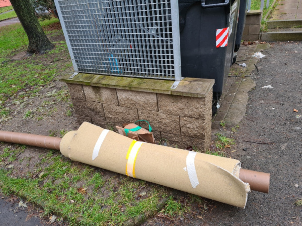 koberec jiz uklizen (byl posunut k domu cislo 16- tam doslo k uklidu), ale zde za timto domem zustala role od koberce a neporadek, ktery byl zrejme pod tim