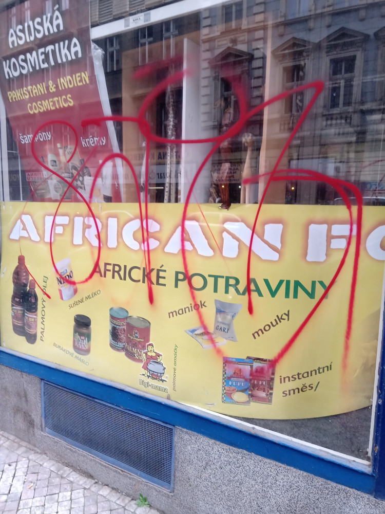 Graffiti na výloze domu Husitská 76/27. Dům je v programu Antigraffiti. Děkuji!