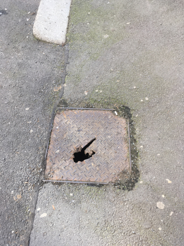 Prorezavělý poklop na chodníku ve Vlkově ulici - proti ZŠ