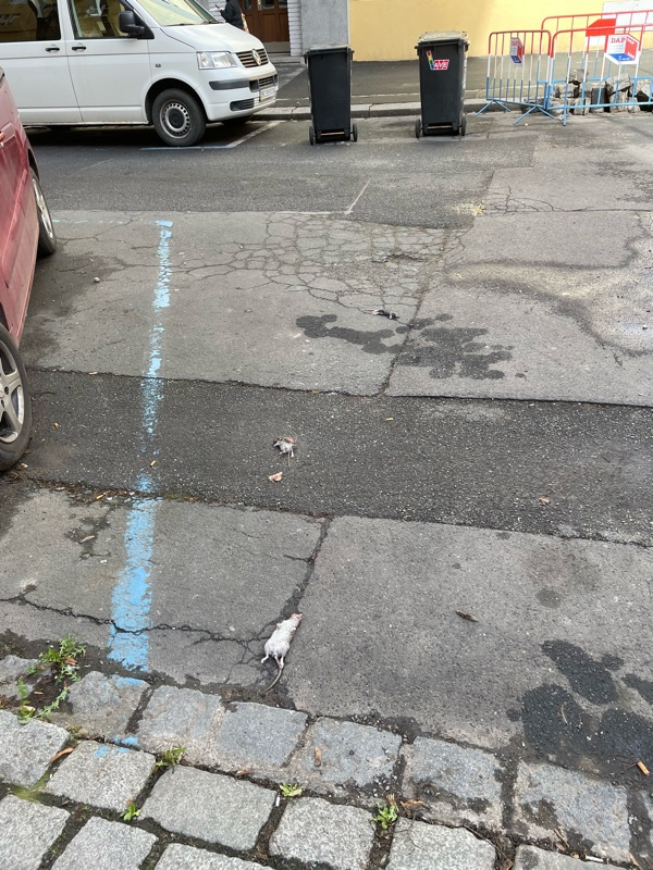 Mrtve mysi/krysy na zemi. Zrovna je tu inpocjozi uklid ulic… zastavil se nad tim se slovy: “fuj to brat nebudu”