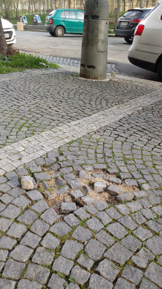 Pro velké mezery mezi kostkami je štěrk z nich vymetán strojem při čištění chodníků a kostky se uvolňují. Často tak vznikají díry a lidé i děti o ně zakopávají. V domě je školka pro malé děti. Závada je před vchodem do domu Roháčova 73/1067, Praha 3.