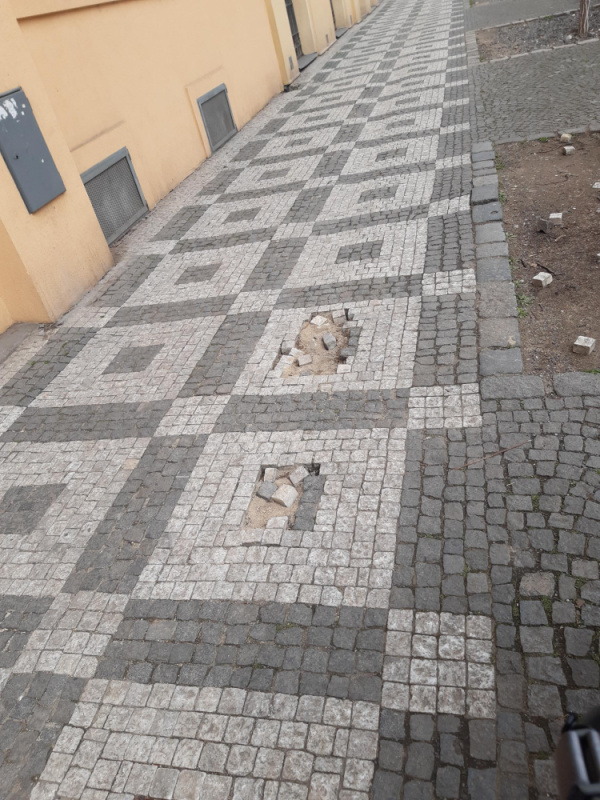 Porušená dlažba chodníku - malé kostky. Korunní 113, celkem na 4 místech poblíž vchodu.