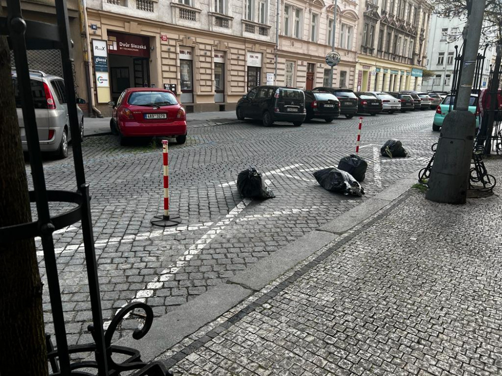 Hotel ve slezské ulici již delší dobu blokuje parkovací místa pro rezidenty. V nedávné době začali odkládá pytle s odpadem přímo na ulici. Je možné s tím něco udělat? / jde o tábor parkovacích míst.
