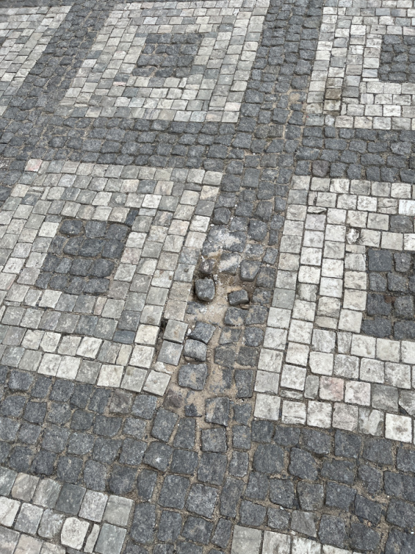 V průběhu času se na chodníku začaly objevovat problémy, vykoplá dlažba a tedy mezery mezi dlažbou v ulici Vinohradská č. 164.