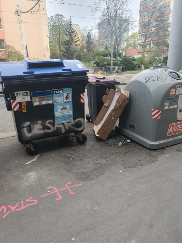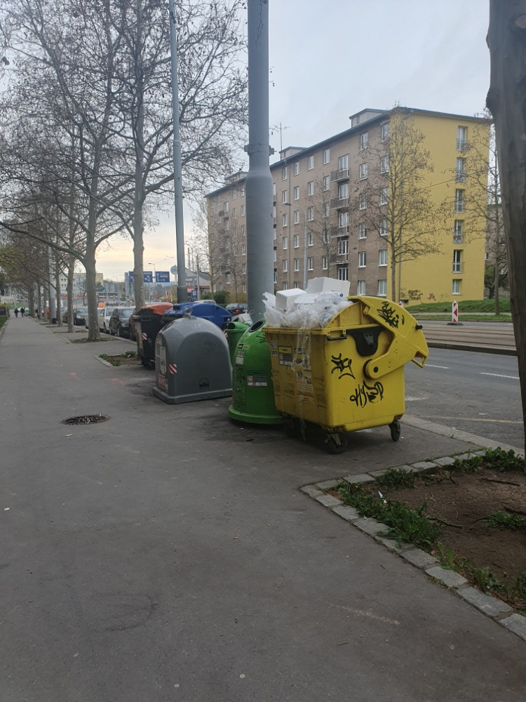 nevyvezeny kontajner s plasty a neporadek rozlitany okolo (naproti na trave, cca 100 m v obou smerech).Neporadek je i vedle popelnice na papir