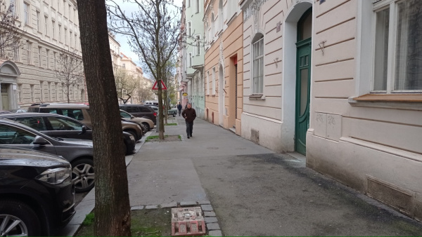 Na chodníku před domem Kubelíkova 30 se nachází zapomenutý podstavec po přenosné DZ bez uvedeného vlastníka.