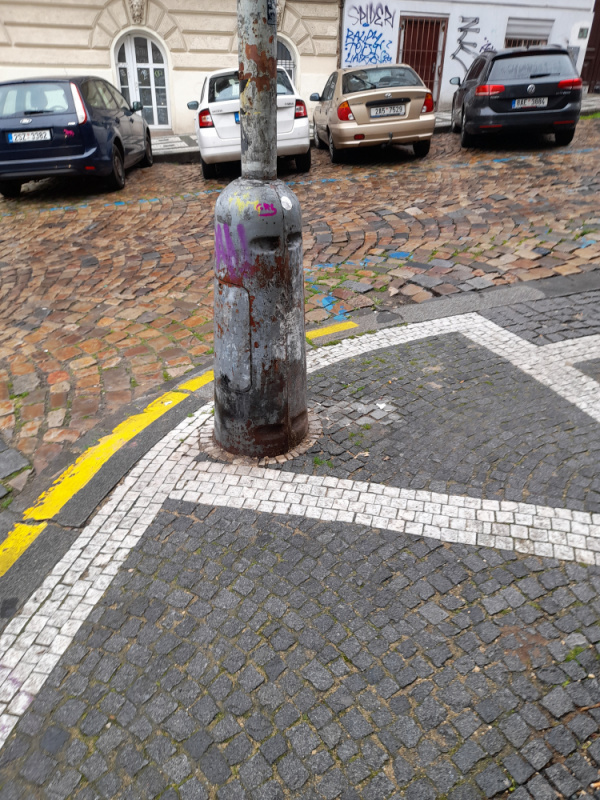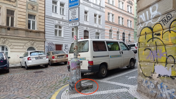 Na křižovatce Víta Nejedlého x Bořivojova se nachází zapomenutý podstavec po přenosné DZ či přenosném zábradlí bez uvedeného vlastníka.
