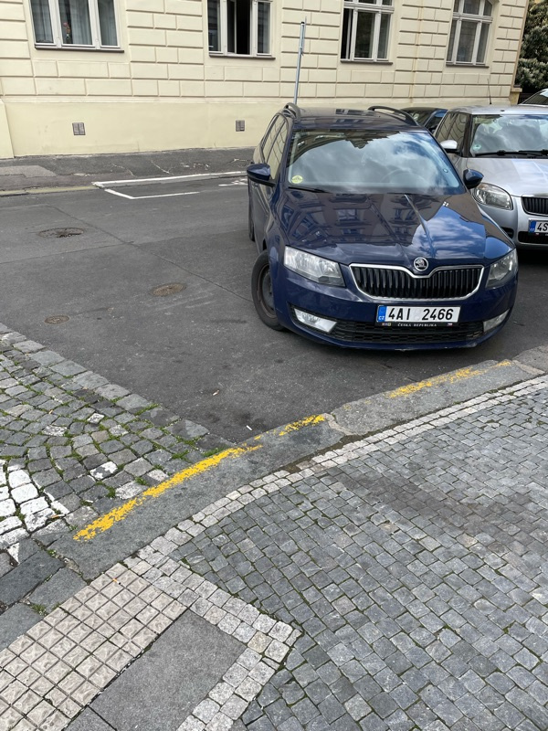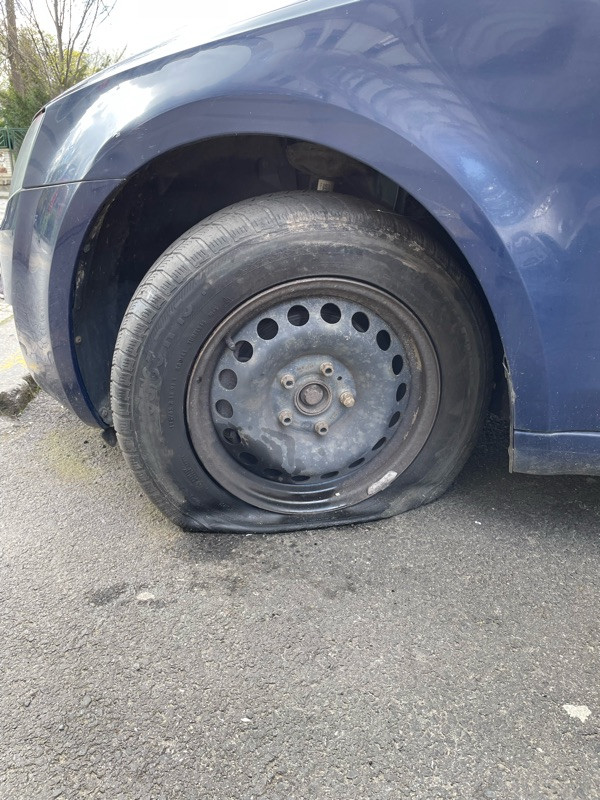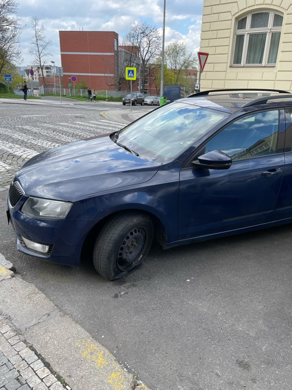 Auto s vyfouklym kolem stojici mimo parkovaci zonu u krizovatky. Auto tam stoji uz min.3 tydny