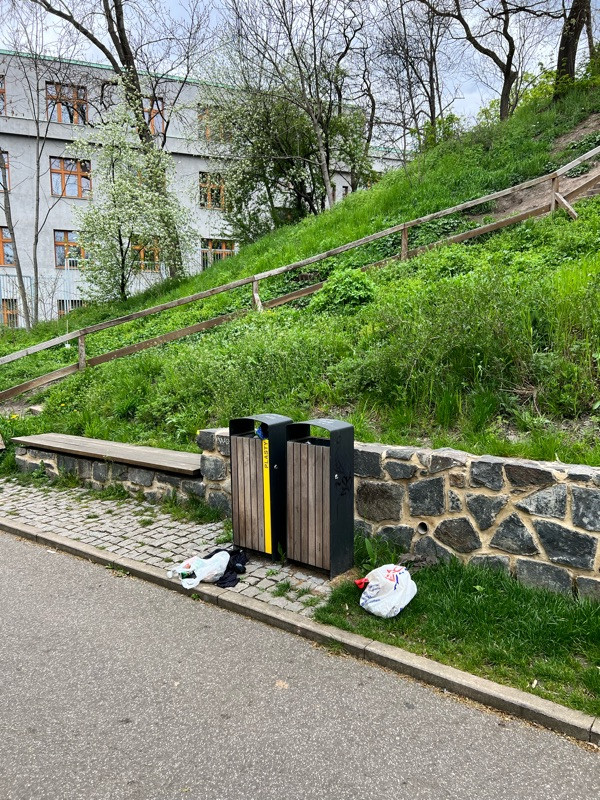 Odpadky kolem odpadkového koše na stezce pod Vítkovem. Stanoviště naproti hostelu vedle dřevěných schodů na Vítkov.