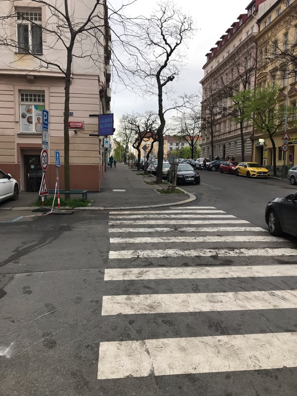 Křižovatka ulic Jagellonska a Milešovská. Chodník špinavý od oleje včetně přechodu pro chodce a návazné křižovatky.