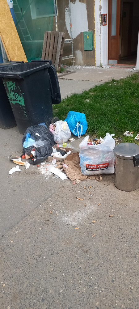 Nepořádek po řádění bezdomovců u domu Na vrcholu 8 a naproti na vrcholu 5