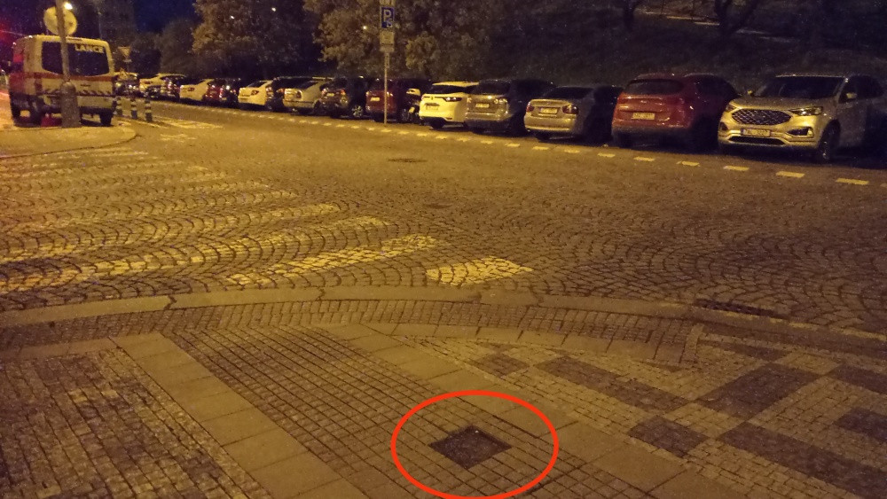V ulici Jeseniova se na křižovatce s ulicí Zelenky-Hajského u lampy 300 079 nachází díra v dlažbě chodníku.