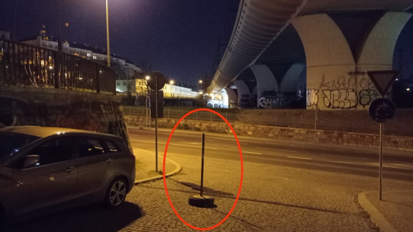 V ulici Trocnovská se u lampy 300 401 nachází zapomenutý přenosný sloupek pro mobilní plot či přenosnou značku.