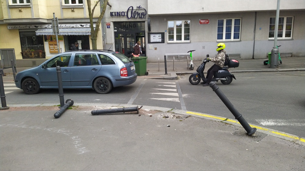 Vyvrácené sloupky u přechodu pro pěší v Biskupcové ul.32 proti kinu Aero.