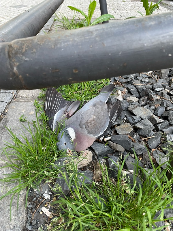 Mrtvý holub na chodníku, před vchodem Kolinska 18